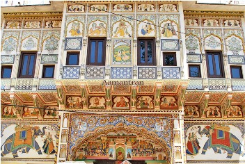 In the rich heritage of India, Shekhawati region is an open art gallery in the north-west of Rajasthan. In the midst of Shekhawati, Mandawa holds a unique image of the Havelis or the rich mansion built by the merchants or Marwaris. The lavishly decorated Havelis with lively frescoes inside and outside creates an open art gallery with vivacious colors and themes created from Indian Mythology to modern influence of the British Raj in India in the 19th and 20th century.